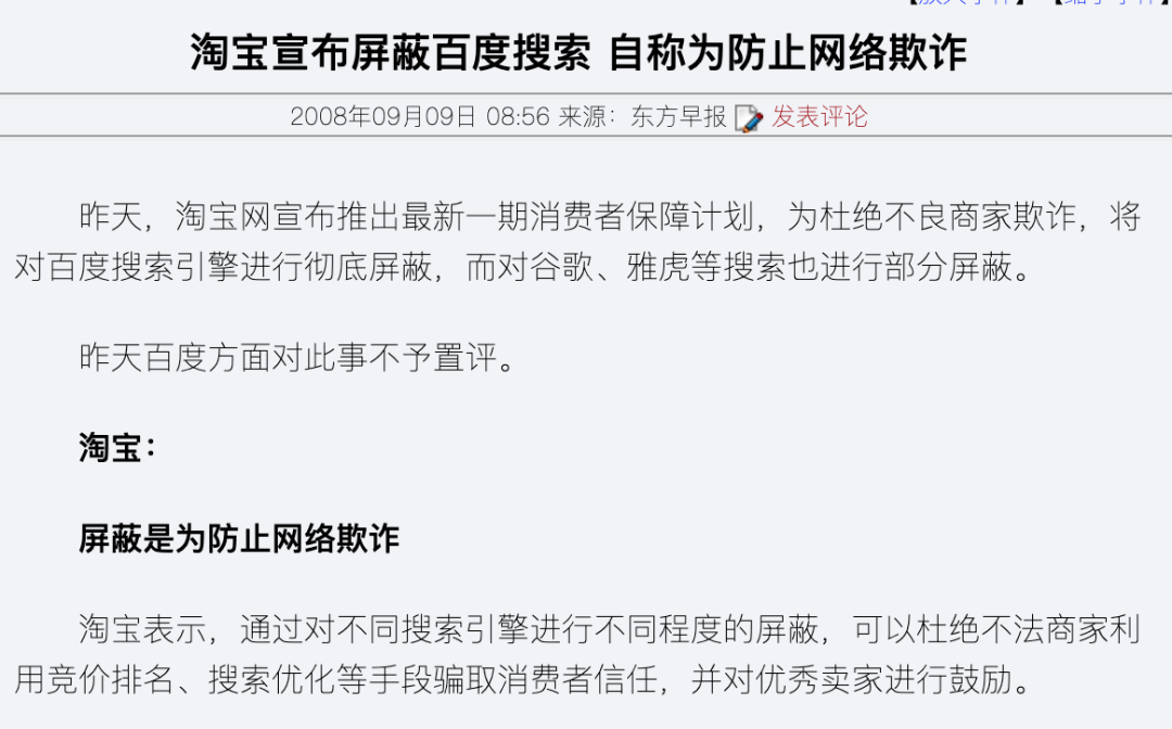 2008年9月8日,淘宝宣布屏蔽百度爬虫,也就是说百度的搜索结果里不会出现淘宝内页的商品。