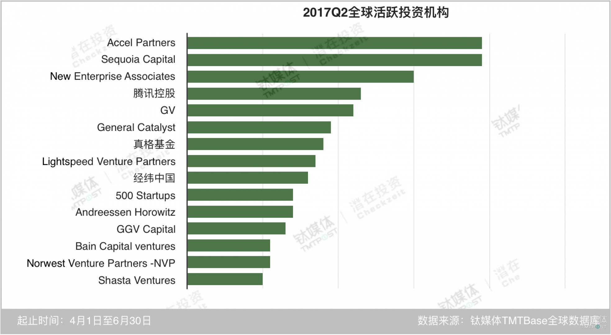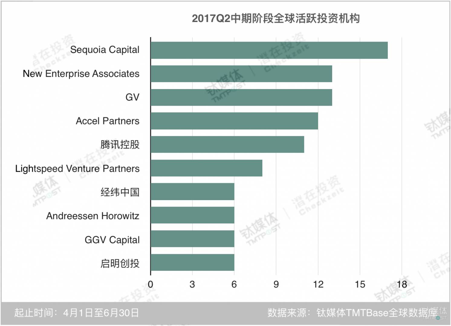 钛媒体TMTBase全球数据库,2017年第二季度共收录1335起全球融资事件,其中国内共735起,国外600起。综合这1335起融资事件,我们以投资机构为分析对象,深入全球风险投资生态系统,梳理出2017年第二季度较为活跃的投资机构,从中探寻2017年市场发展的潜在方向。