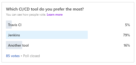 以 G2 为例,Jenkins 在 G2 上平均评分为 4.3 星,有 288 条评论;GitLab CI/CD 在 G2 上的平均评分为 4.4 星,有 270 条评论。可以说,Jenkins vs GitLab CI/CD 是一场旗鼓相当的竞争。有趣的是,Jenkins 是在 2011 年发布的,而且在 CI/CD 业务上,它一直是测试人员的首选。然而,自 2014 年发布以来,GitLab CI/CD 一直凭借尖端的功能而高居榜首。我们在发布这篇文章时,在社交媒体上进行了一次民意调查。