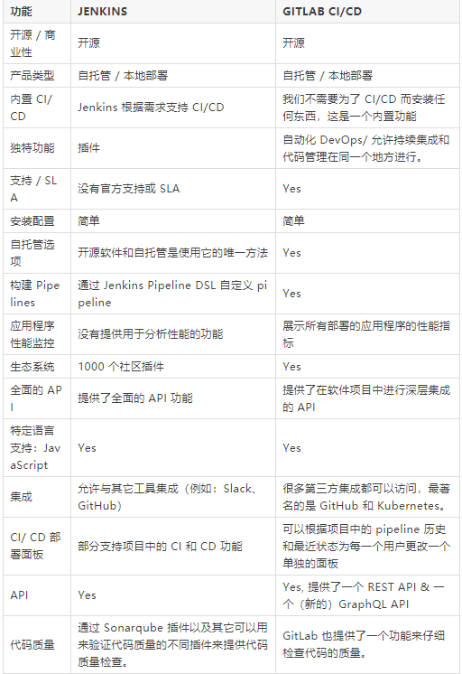 Jenkins 和 GitLab CI/CD 都有它们非常擅长的领域和各自的技术追随者。然而,在讨论 Jenkins vs GitLab CI/CD 之争时,会讨论许多功能。下图是这两个 CI/CD 工具提供的所有功能的比较。