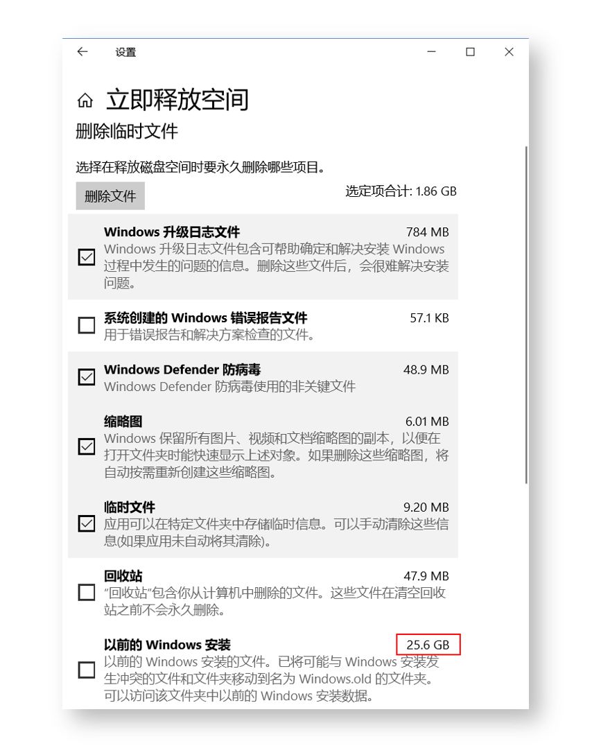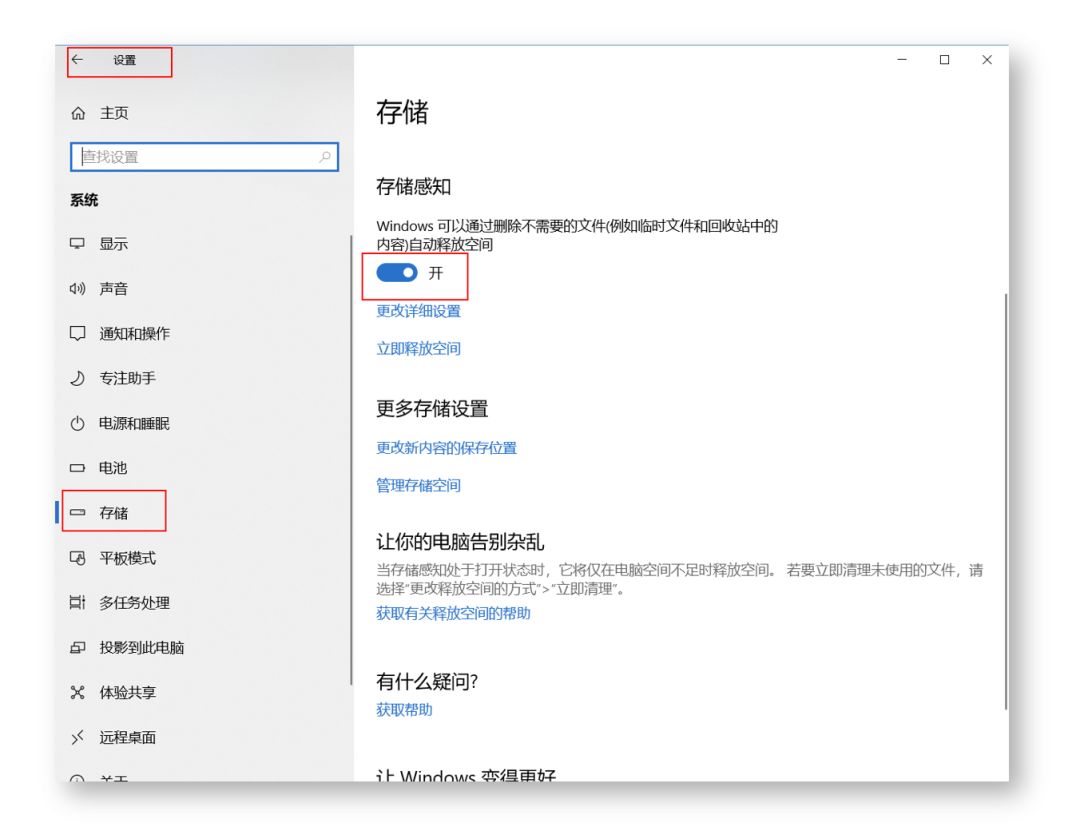 Windows 10 在设置中有一个【存储感知】的功能,你可以在设置 -> 系统 -> 存储 中找到它并开启。此外,你还可以点击 【立即释放空间】删除之前的系统更新文件,首次删除可能会吓你一跳,它可能会占用 几十G ,勾选后点击删除即可。