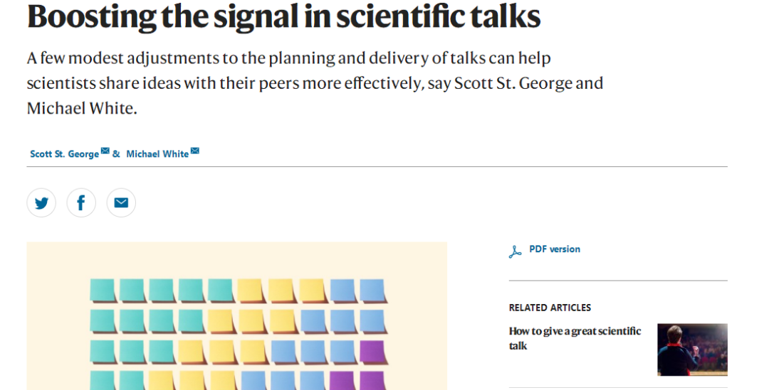 交流科研进展和想法除了公开发表论文,最好的方式无疑是公开演讲、报告。毕竟,通过自己的语言将自己的科研想法“讲”给大家听,更多的是展示学术魅力。文章地址:https://www.nature.com/articles/d41586-020-00838-3但如何才能做好一场学术演讲、报告呢?日前,Nature发表了一篇题为《Boosting the signal in scientific talks》的文章,从报告的中心思想、PPT的展现方式以及如何考虑听众的感受等13个维度,给“科研er”描绘了一个好的学术报告究竟长什么模样。下面,AI科技评论将文章编译如下,请欣赏~做学术演讲好处非常多,除了能帮你打开“新的合作之门”,增加你获得科研资金的机会,还能够让其他人对你的科研想法做出回应。但是内容过于繁杂的学术演讲往往令人困惑、枯燥乏味。下面给出几个建议,能够让你的演讲和研讨会变得更加有趣,更加吸引人。1、不要“一视同仁”。来听报告的人可能不是“业内资深”人士,他们之间的专业背景、兴趣可能会有很大的差别。如果把他们都“一视同仁”,很多人就会因为“不满意”选择离场。正确的做法是在演讲之前,做一个简单的调研,调研的内容包括但不限于:有多少人参会?观众对演讲话题的了解程度如何?观众对演讲话题有什么先入为主的看法?总之,你对你的观众了解的越多,就越有可能留住他们。2、明确中心思想。把研究内容通过演讲的形式表达出来通常比较容易,但是,听众能不能记得你演讲的中心思想却是个“技术活”。正确的做法是,在制作PPT之前,用一两句话写下你想传达的信息。然后狠下心来删掉那些和中心思想不相符的PPT。3、首先表达重要的内容。在演讲的最开始往往是观众精力最充沛的时候,所以要在开场的第一分钟,用简短的几句话,介绍最关键的信息。注意不要使用“行话”或者技术细节。如果必须要分享的话,可以把技术细节挪到后面一点。这样,才能保证每个人都能理解你所分享的内容以及它为什么这么重要。4、有计划的做PPT。不要随意把旧的PPT翻出来,并试图让它们重新焕发光彩。这样的做法,往往会导致整个PPT内容密密麻麻。如果“计划”不善,信息混乱、无关PPT太多的问题也会出现。5、PPT就是故事展示器。想要以讲故事的方式进行报告,最好的方式是借用拍电影的手法,即做一个情节的草图展示,用来设计情节、角色、场景和效果。相对应的,演讲人可以用此类方法勾画出一个草图来计划演讲的主线,大纲,分层,递进,转折及总结。另外,在花时间制作PPT之前,先确定哪些视觉辅助工具对你“讲故事”有帮助是非常重要的。6、善待你的听众。当讲座听多了,观众的精神疲劳是不可避免的,尤其是在那些持续一周的科学会议里,与会者往往会坐着听几十个讲座。所以,演讲者要尽其所能使内容易于消化。7、观众是来听演讲,而不是来阅读的。一般人类的阅读速度大约是说话速度的两倍,所以,不要把充满文字的PPT塞在一起,然后当做你的演讲剧本。因为,听众可能在你大声朗读完PPT之前就已经读完了内容。这中间会存在等待的时间差,在这期间听众会变得无聊和耐烦。过多文字会让听众不得不选择是听还是读。最好的方法是放置几个关键词并通过演讲扩大关键词内容。8、图片非常重要。图片比文字、说话更有冲击力。你的实验室、研究标本以及其他的照片能够帮助建立与听众的个人联系。除此之外,小视频、动图也是非常好的展示方式。9、照顾后排的视觉效果。避免使用复杂的图表,尤其是排版密集、字体过小、表格较多的展示并不利于信息交流,还会造成视力疲劳。例如,一张显示四、五或六位数字的PPT,可能只能用作“视力测试”。10、有的放矢,使用简化和放大规则。尽量一张幻灯片仅呈现一两个图片元素,展示要占满整张PPT,不要有边框或者留白。在安排表格内容时,只突出那些对弈论点至关重要的数据。如果有人询问更详细的技术细节,就给他分享附带的文件或数据集。总之,要让所有东西的展示,包括数字、文字、图片等都带来轻松的阅读。11、认真解释你的数据。如果面向的是非专业人士听众。那么,就要解释术语和每个坐标轴、曲线的意义;反之,如果向本领域资深人士介绍,则可以跳过术语、坐标轴和不同参数的意义。但无论如何,必须解释数据背后表达的意义。12、不要用单词,而用一句话做标题。这个做法的目的是让听众对展示“有结论性”的认知。例如,“厄尔尼诺和近地面风”,显然不如“厄尔尼诺导致冬季近地面风减缓20%”。13、打破经验法则。演讲界盛传的“一分钟一张PPT”的经验只在少数情况下适用,如果你想使用大量的PPT来支撑你的演讲。来吧!试试一分钟四张PPT的效果。所以,把你的演讲看做一桌子菜,这桌菜包含的卡路里是固定的。无论盘子有多大,所装的总菜量都是固定的。因此,可以增加PPT的数量,而不增加演讲的内容量。总结一下,把控住整个报告的逻辑,把它看做一个有趣的故事,说清楚你做了什么,为什么你做的事情非常重要。不同于期刊论文形式的展现,报告的形式需要简单而清晰。