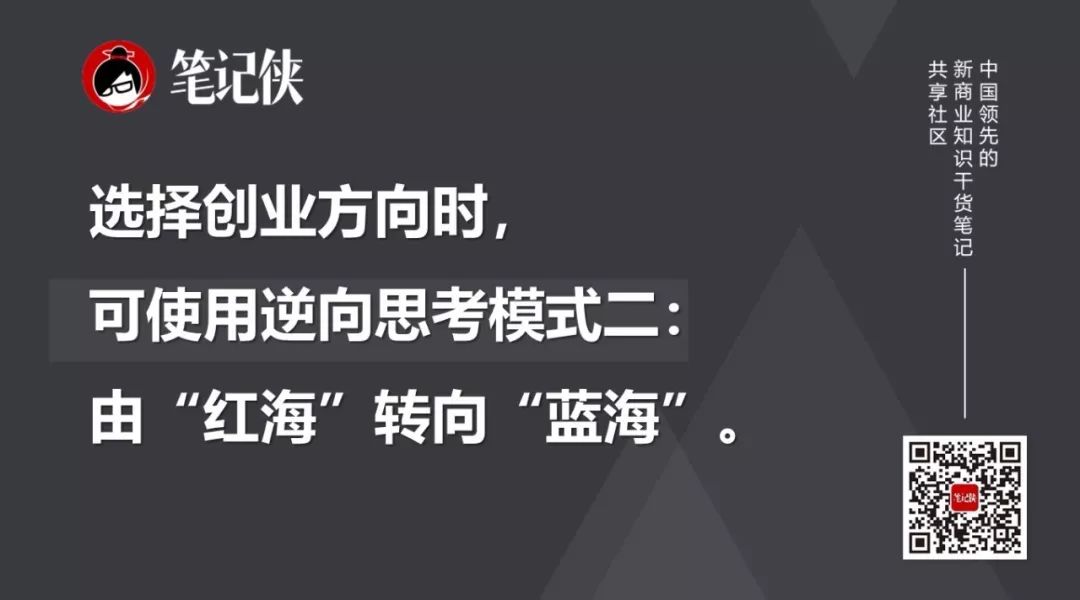 大多数人都是在用“正向思维”去寻找创业的方向,所以,如果你能运用“逆向思考力”去寻找创业方向,就有可能找到“蓝海”,从而提高创业成功的几率。
