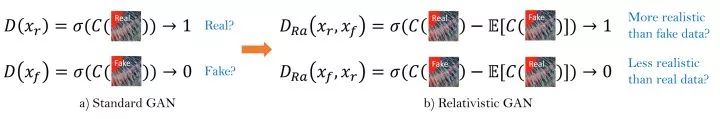 就变成了公式(6)。公式(11)比公式(7)和(8)少一项是因为公式(8)中的第1项和生成器G无关。而Relativistic GAN,这里变成了相关的,把公式(11)改写为: