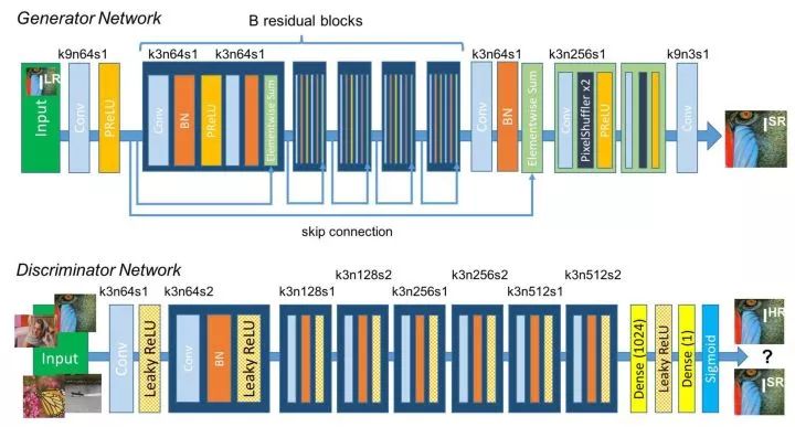 到这里SRGAN就差不多讲完了,至于生成器和判别器使用了什么样的CNN不是本文重点,大家看一眼就行: