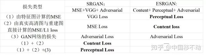 顺便说一句,SRGAN和ESRGAN给损失函数起的名字不同!我不知道ESRGAN作者没延续SRGAN的名字是写错了还是有意为之,反正ESRGAN给loss起的名字比SRGAN合理!SRGAN中的Perceptual Loss是指整个生成器的损失函数,而ESRGAN是指由特征图计算出来的Loss;SRGAN中的Content Loss是指原图的MSE+其特征图的MSE,而ESRGAN是指由真实高清图与重建图直接计算的L1 loss。