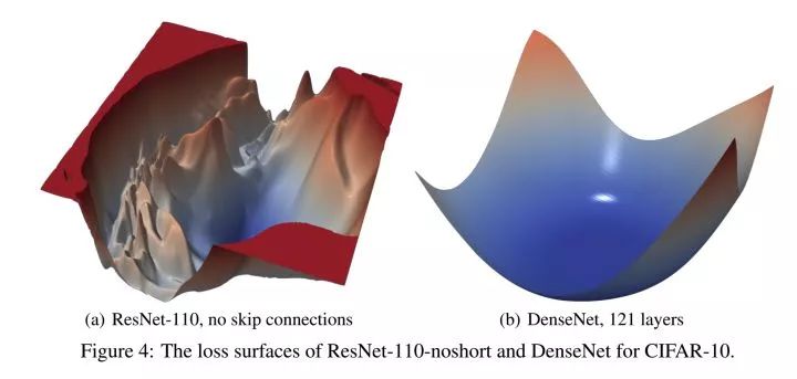 论文[6] How does batch normalization help optimization指出,BN的作用是网络更容易优化,不容易陷入局部极小值。ESRGAN去掉了BN,可以猜想,如果保持原有的Residual Block结构,网络会变得非常难易训练,而且很容易陷入局部极小值导致结果不好。论文[7] Visualizing the loss landscape of neural nets可视化了一些网络的解空间: