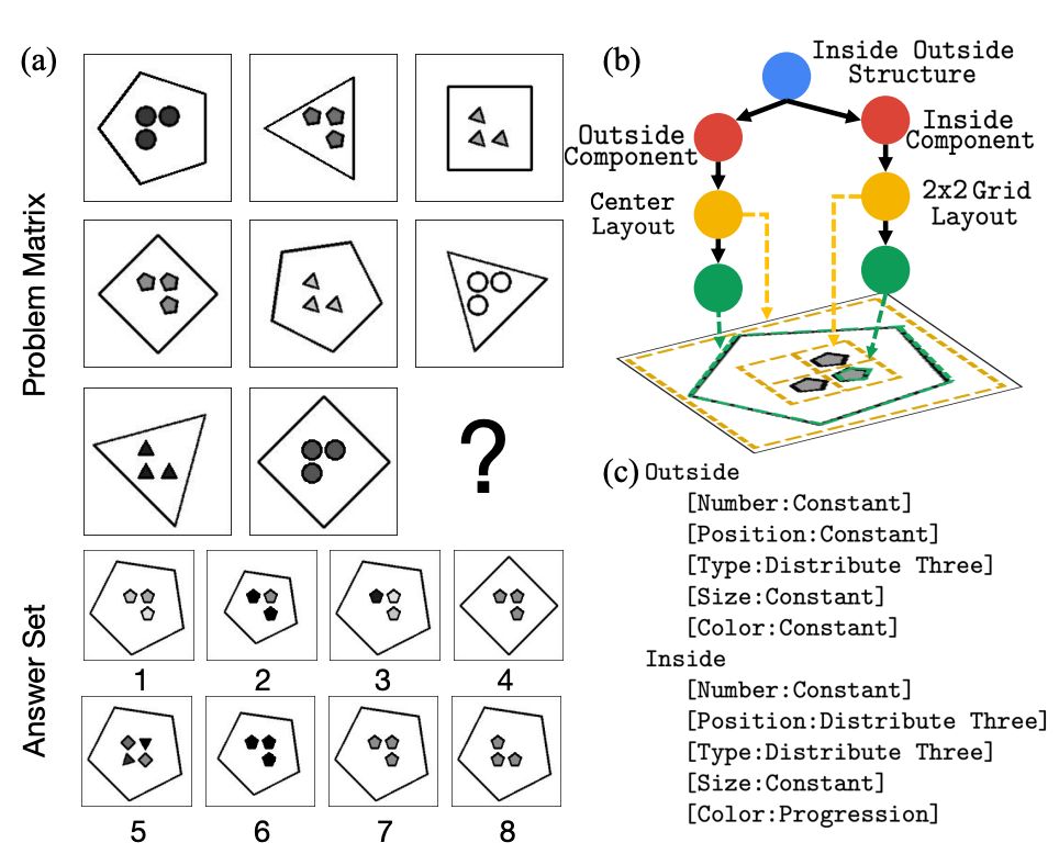 图 1:(a) RPM 示例。其中一项任务是根据结构和类比关系,选择出最符合逻辑的图像。每个图像都有一个底层结构。(b) 具体地说,在该问题中,这是一个由内而外的架构,外部组成是一个只有一个中心的目标分布,内部组成是一个 2×2 的网格布局。图 2.(c) 中的细节列出了 (a) 中的规则。规则的各种性质组合起来使这个问题变得难解。正确答案是 7。