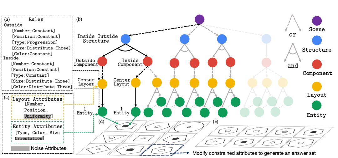 图 2:RAVEN 创建过程。(b) 说明了 A-SIG 中使用的语法生成规则。(c) 显示布局和实体具有关联的属性。(a) 给定随机采样的规则组合,首先修剪语法树(修剪透明分支)。然后将图像结构与来自 (b) 的属性值一起采样,用黑色表示,并应用规则集 (a) 生成单个行。重复该过程三次得到 (d) 中的整个问题矩阵。(e) 最后对约束属性进行抽样,并在正确的答案中改变它们以打破规则并获得候选答案集。