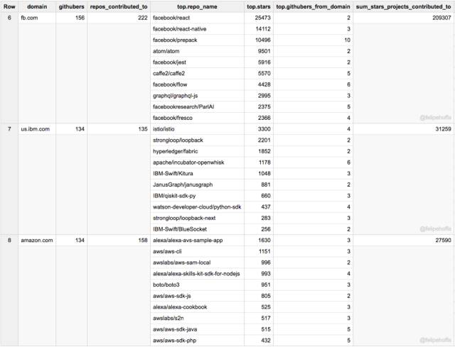 Facebook 和 IBM(US) 的 GitHub 用户数量与亚马逊的相似,但他们贡献的项目收获到了更多的 star(尤其是 Facebook):