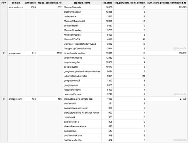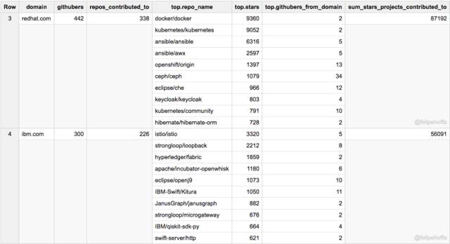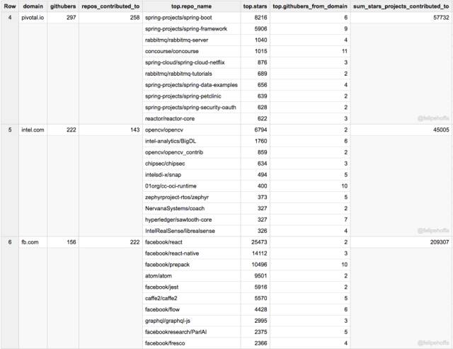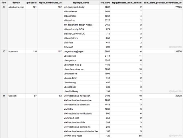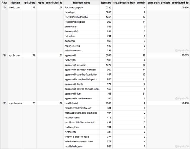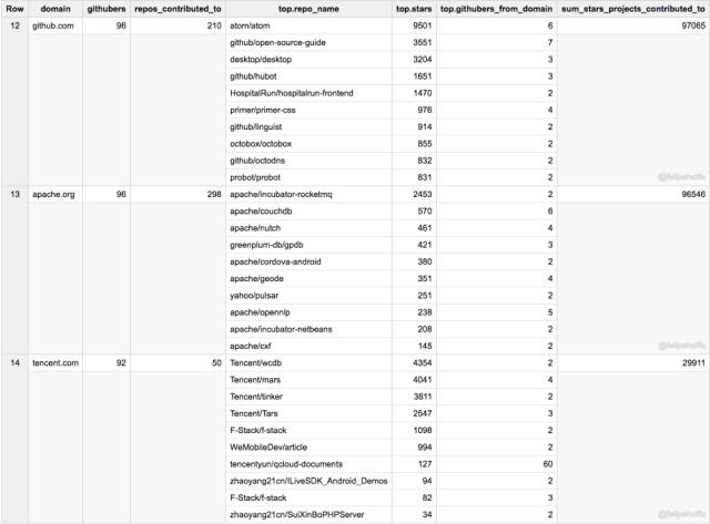 作者对于每个 GitHub 用户都尽量分辨了他们属于哪个组织,并且只关注在 2017 年增长超过 20 个 star 的仓库(比如 Apache 目前在 GitHub 有超过 1500 个仓库,但只有 205 个在今年获得了 20 个以上的 star。因此,这里只分析这 205 个仓库的提交情况)。