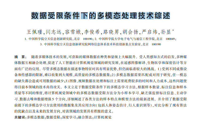 针对在数据受限条件下多模态数据处理面临的 各种挑战和难题,已有研究者提供了一些解决思路, 但是尚未形成相关的综述文献。 因此,本文总结了 数据受限条件下多模态分析处理的研究方法和进 展,以及多模态数据在不同领域的应用情况。 首先 阐述了多模态数据在计算机视觉方向的研究现状与 数据受限的难题挑战,介绍了对不同数据受限情况 的处理方法,展示该研究的背景和目的。 然后分类 阐明不同数据受限处理方法的现状与研究方法,区 分不同的受限情况所面临的困难和挑战。 最后对多 模态数据的各个应用领域的典型数据集进行介绍, 总结目前的研究成果,能够启发未来多模态的应用 前景,展望下一步研究方向。