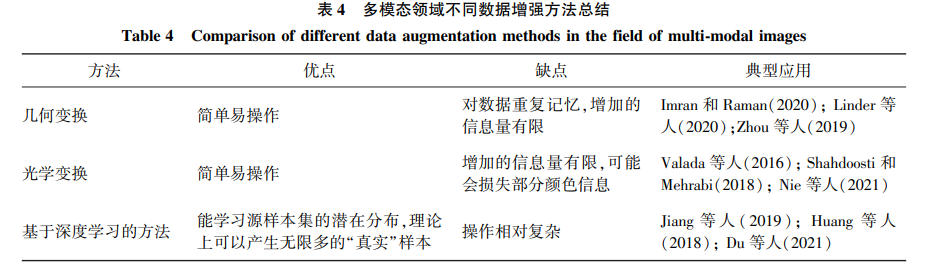 5)数据增强。 在样本较少的前提下,为进行有限 多模态数据的充分利用,数据增强方法通过对原始数 据集进行一系列变换操作,扩张数据的可使用性。
