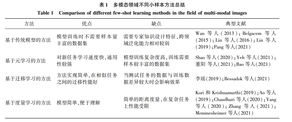 1)小样本学习方法。 在多模态数据不足的情 况下,小样本学习方法仅通过学习少量样本就能做 出正确判断的认知能力,在数据量匮乏的情况下仍 能够有效地学习目标特征。