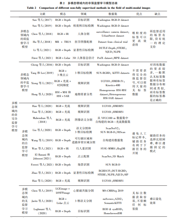 2)缺乏强监督标注信息的方法。 由于数据标 注过程会产生高额的成本,较难获取所有模态的全 部真值标签对模型进行强监督学习。 常见的非完全 监督的方法有基于弱监督、无监督、半监督和自监督 的学习方法,这些方法可以有效改善模态缺乏标注 信息的问题,大大减少人工标注成本。