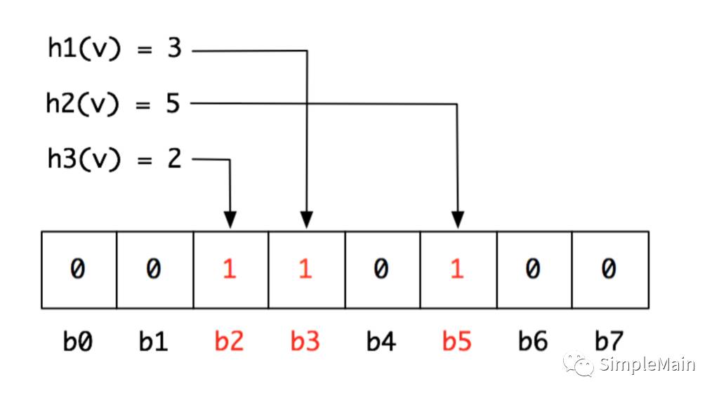 3、当一个值(v)需要放入到存储系统的时候,将这个值进行k次的hash运算,比如:我们将m=8, k=3。就是位图有8个二进制位,然后有3个hash函数。