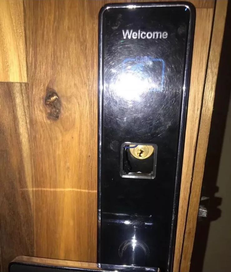 首先,他发现酒店的房门的电子感应区下方,还有一个可以轻松打开的小盖子(上图右侧有钥匙孔的区域),这是为了在房门没电的时候,可以打开盖子用机械钥匙开门。