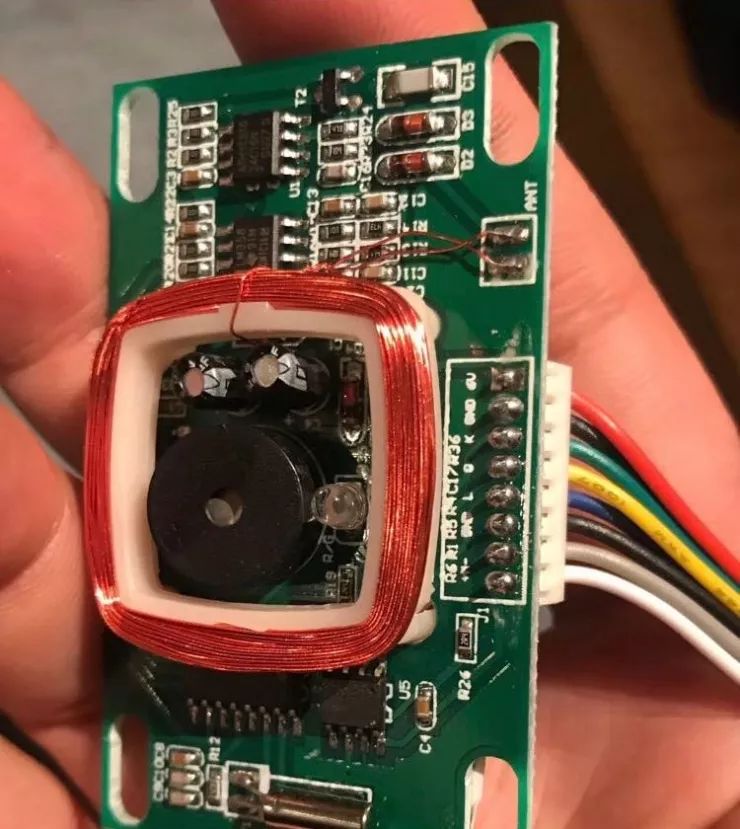 然后,他从这个方形的口伸进去,顺势把这个电子锁的电机线器件掏出来,在研究了一下各个颜色的线后,基本确定白色和灰色两根标记+M-的线是电机线。