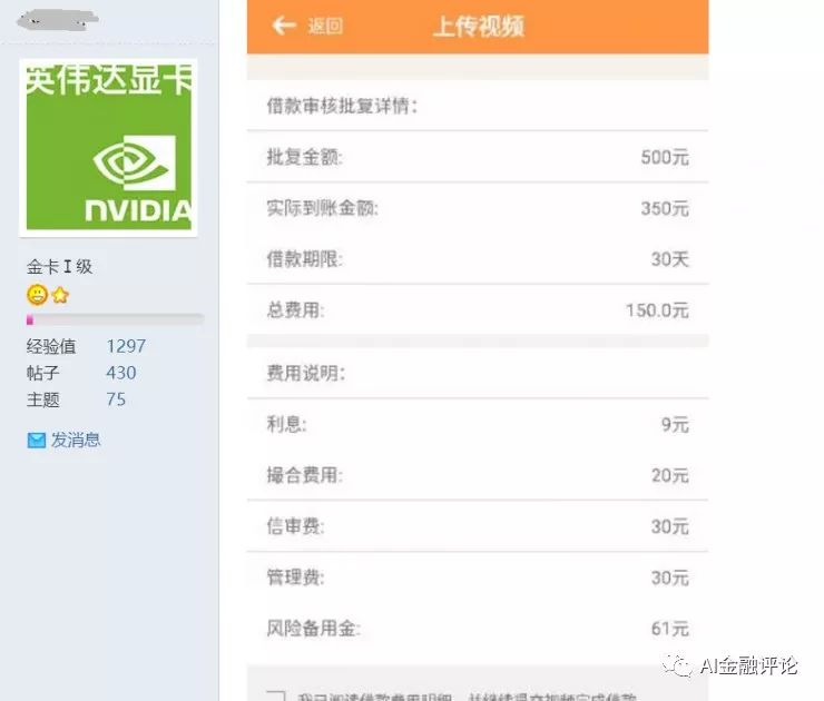 第一种情况确实存在,一些平台公告暂停现金贷业务。仍在放款的平台是少数,且额度并不高,用户借款区间集中在500~1000,7~14天还清。据网友截图,其中一款名为“屌丝贷”的产品年利率高得惊人,首先注册需付20元,500元借款30天,实际到手只有350元,相当于砍头息150元,综合息费为408%,远超36%法律红线。