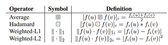 给定两个节点 , 我们有它们对应的向量表示 ,然后可以定义一个二元操作来生成边的表示