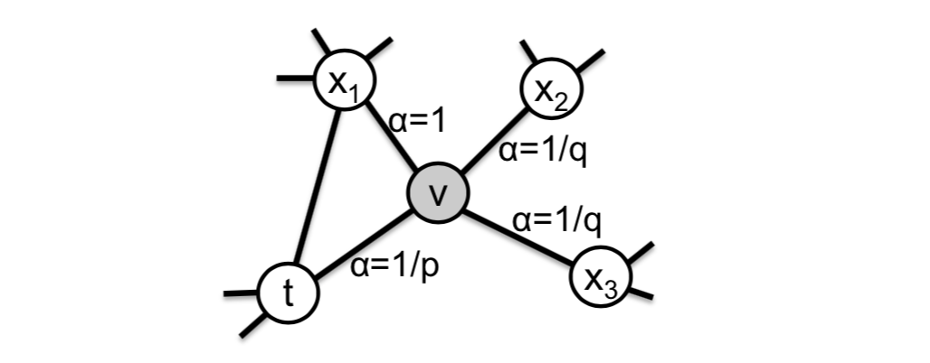 其中, 表示节点 和节点 之间的未归一化概率(即从节点 转移到节点 的概率), 为归一化常数。