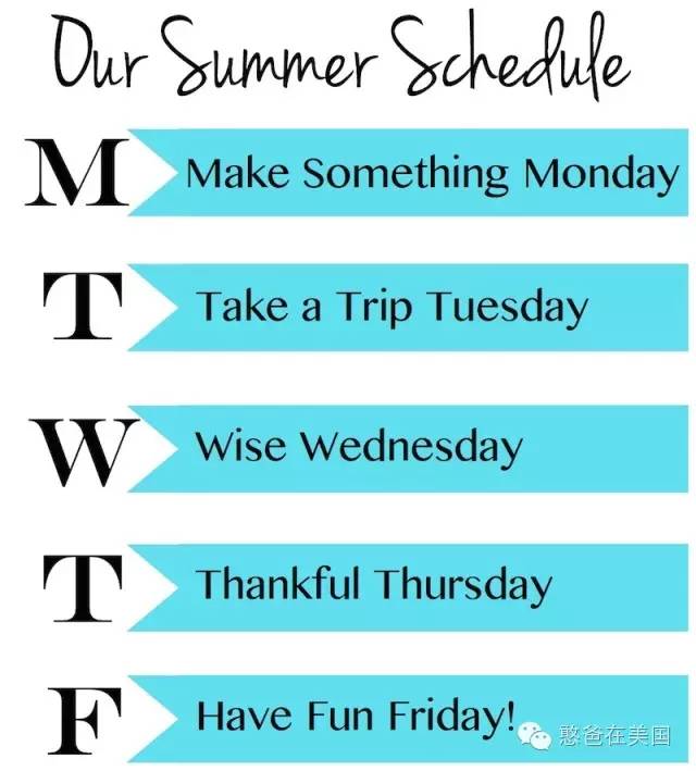 MTWTF就是对应了周一到周五,每天都会安排一个主题!比如礼拜一做个手工,礼拜二来个户外活动,礼拜三学点知识,礼拜四帮助他人,礼拜五做点有趣的事情!
