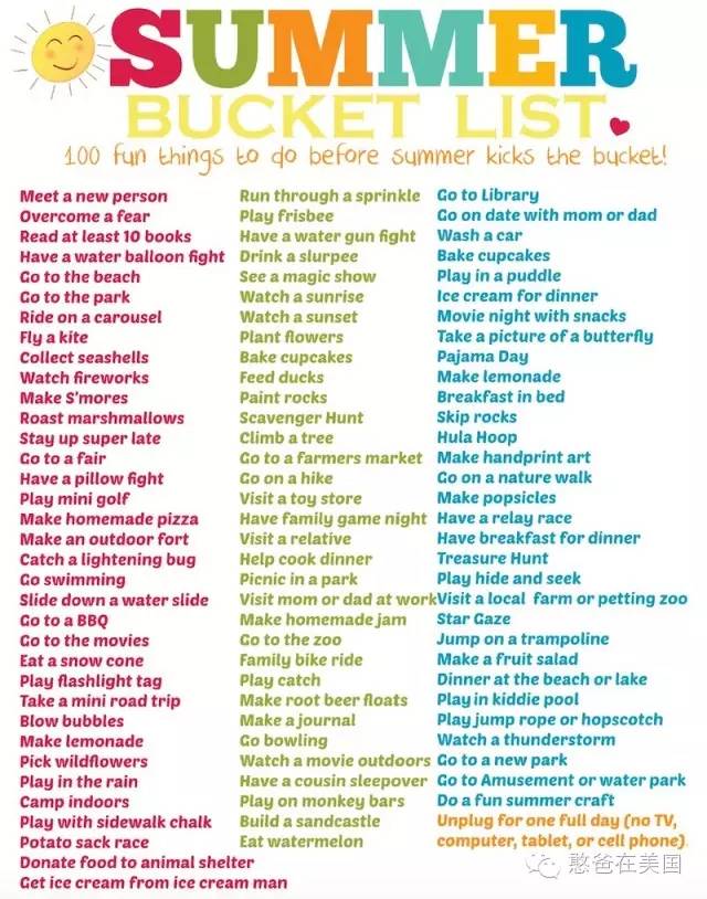 关于这个Bucket List里面的内容,老美总结了100项最有趣、有意义的暑期儿童活动,