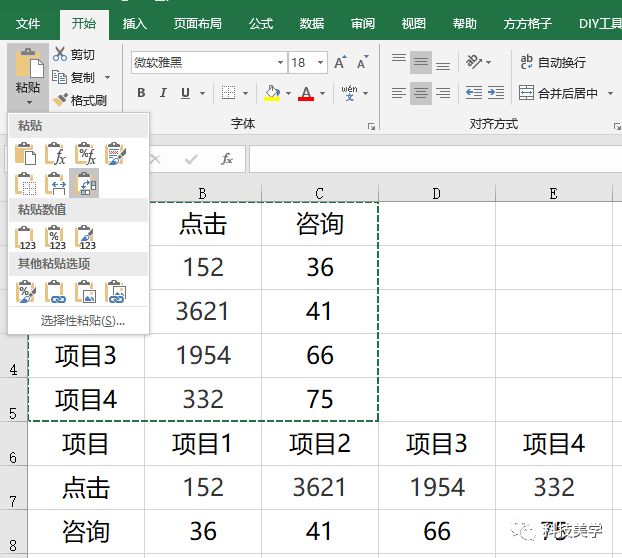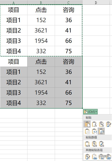 (2)粘贴后的数据右下角会出现一个“粘贴选项”图标,点击这个图标。弹出具体的选项设置,找到“转置”图标并点击,返回到工作表界面后行列互换成功。
