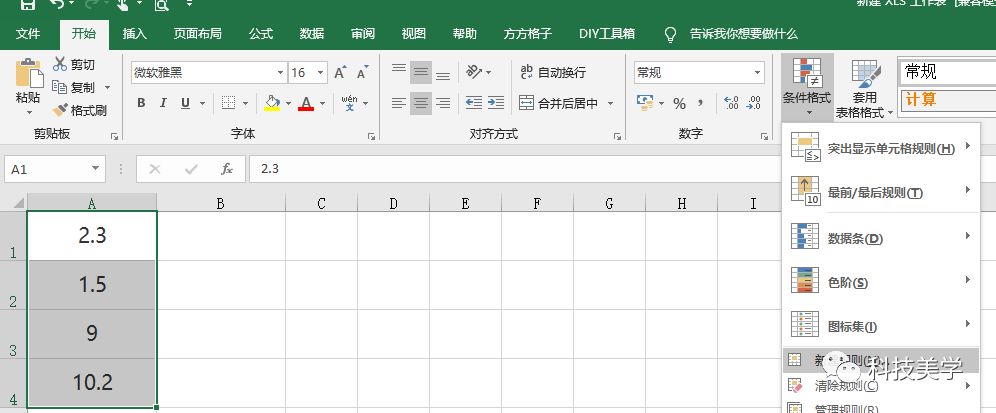 (1)打开工作表,选中需要的单元格,在“开始”菜单选项卡中,点击样式功能区的“条件格式”命令选项,在弹出的选项框中点击“新建规则”;