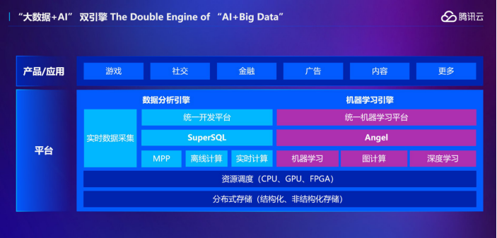 从这张图可以看出双引擎技术架构的整体布局,最底层为分布式存储层,存储结构化及非结构化数据,第二层是资源调度层,做 CPU、GPU 和 FPGA 的管理,第三层是计算层、分析层、数据采集层。最顶层是业务应用层,这四层完整的技术架构,自下而上为腾讯整个应用生态提供支撑。
