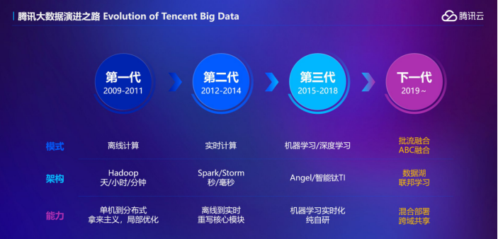 :以 Hadoop 为核心的离线计算时代,直接用社区的版本计算,再做一些局部优化,腾讯第一代大数据平台由此构建。从关系型数据库到自建大数据平台的全面迁移,腾讯用了三年。