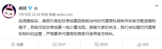 7月19日,就美团外卖使用清真食品箱一事,美团官方微博发表回应,“经调查核实,美团外卖在甘肃临夏回族自治州的代理商私自制作非官方配送箱和扇子,目前仅在甘肃临夏一地少量出现。”