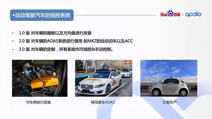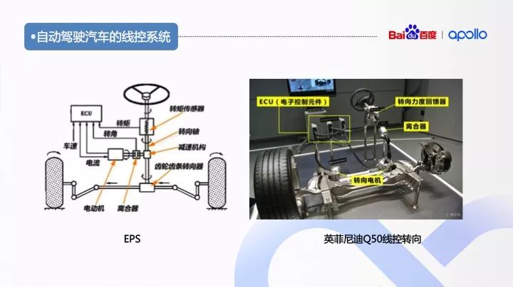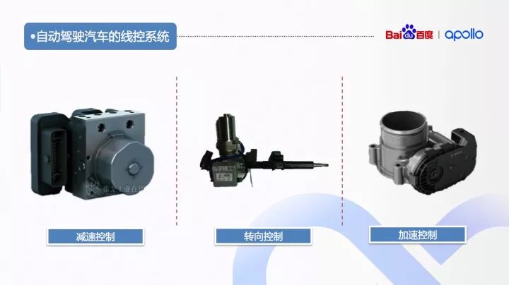 车辆控制:自动驾驶需要用电信号控制车辆的转向、制动、油门系统,其中涉及到车辆地盘的线控改装,目前在具备自适应巡航、紧急制动、自动泊车功能的车上可以直接借用原车的系统,通过 CAN 总线控制而不需要过度改装。