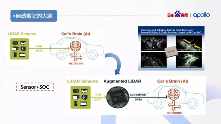随着自动驾驶的技术发展,算法不断完善。算法固化后可以做 ASIC 专用芯片,将传感器和算法集成到一起,实现在传感器内部完成边缘计算。进一步降低后端计算平台的计算量,有利于降低功耗、体积、车规化。其中以 Mobileye 为标杆性企业。