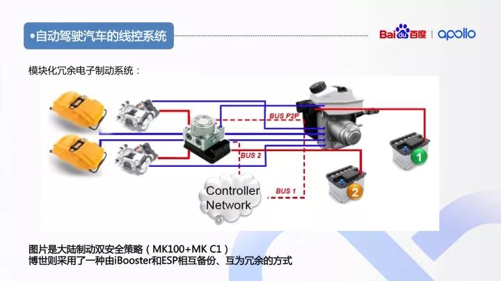 上图是大陆的线控制动解决方案,MK C1 与 MK100 组成冗余线控方案。MK C1 将制动助力以及制动压力控制模块 (ABS、ESC) 被集成为一个结构紧凑、重量轻省的制动单元。MK C1 能满足自动驾驶对压力动态特性更高的要求,电触发的紧急制动所产生的制动距离要短得多。MK100 是大陆的汽车电子稳定控制系统(ESC),在汽车防抱死制动系统 (ABS) 和牵引力控制系统 (TCS) 功能的基础上,增加了车辆转向行驶时横摆率传感器、测向加速度传感器和方向盘转角传感器,通过 ECU 控制前后、左右车轮的驱动力和制动力,确保车辆行驶的侧向稳定性。