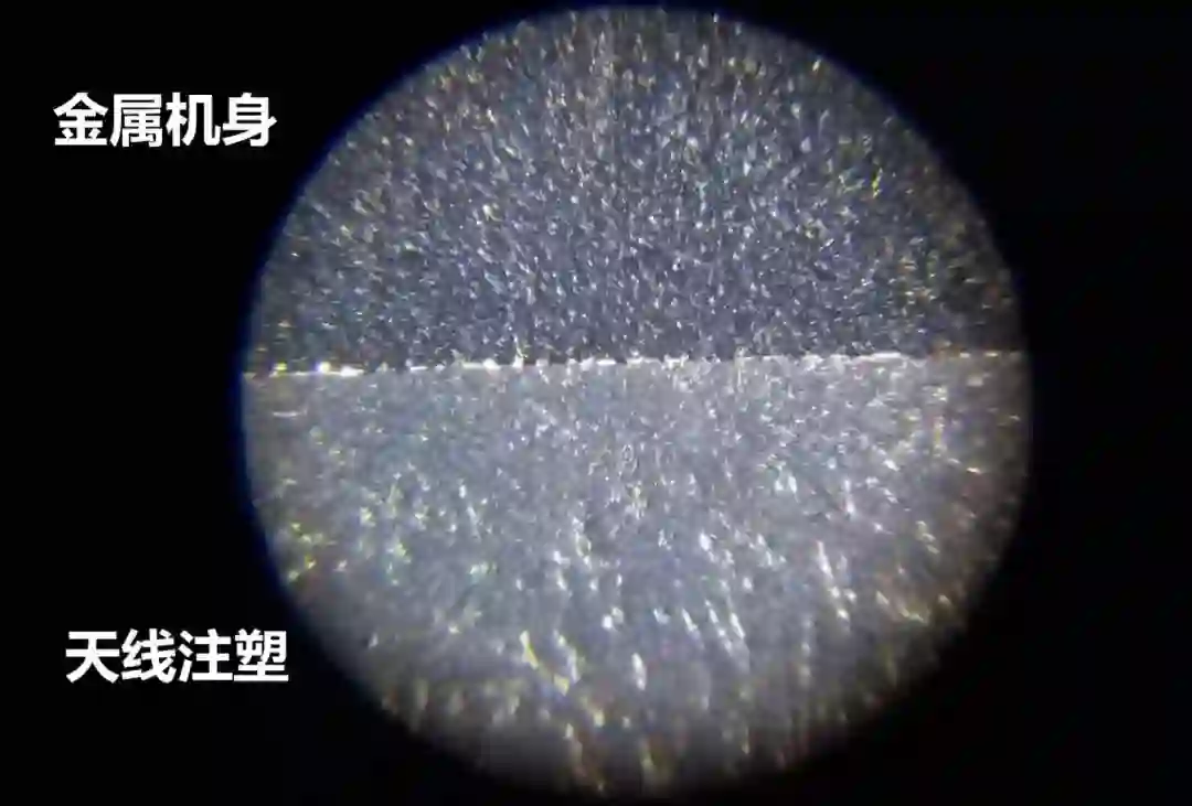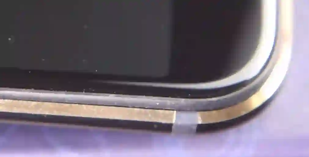 2.5D 玻璃跟一体金属机身的过度是保护圈加金色倒角。并没有明显的刮手,说明棱角处做了细致的打磨。但是时间长了容易出现划痕。倒角开了 4 个缺口,是注塑天线的延伸。