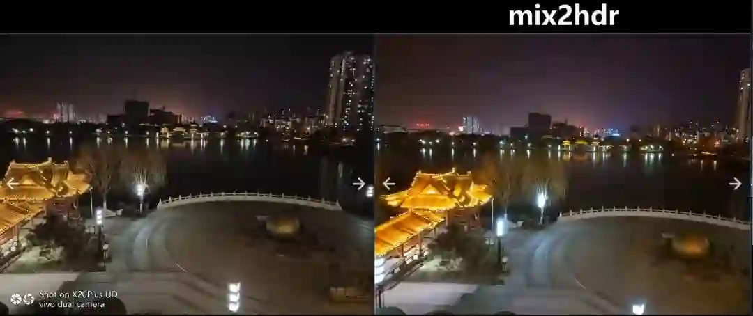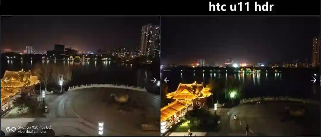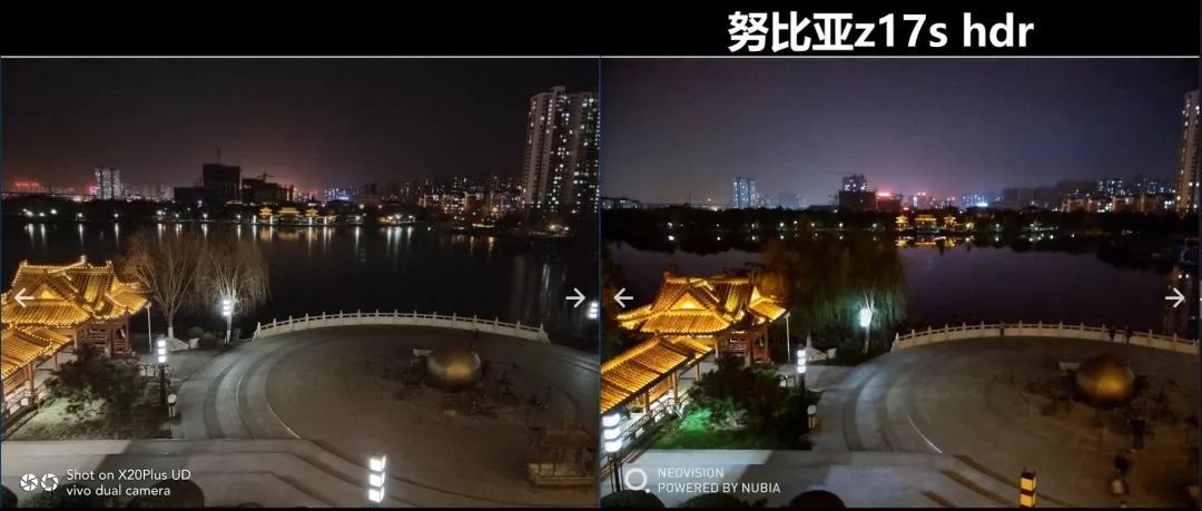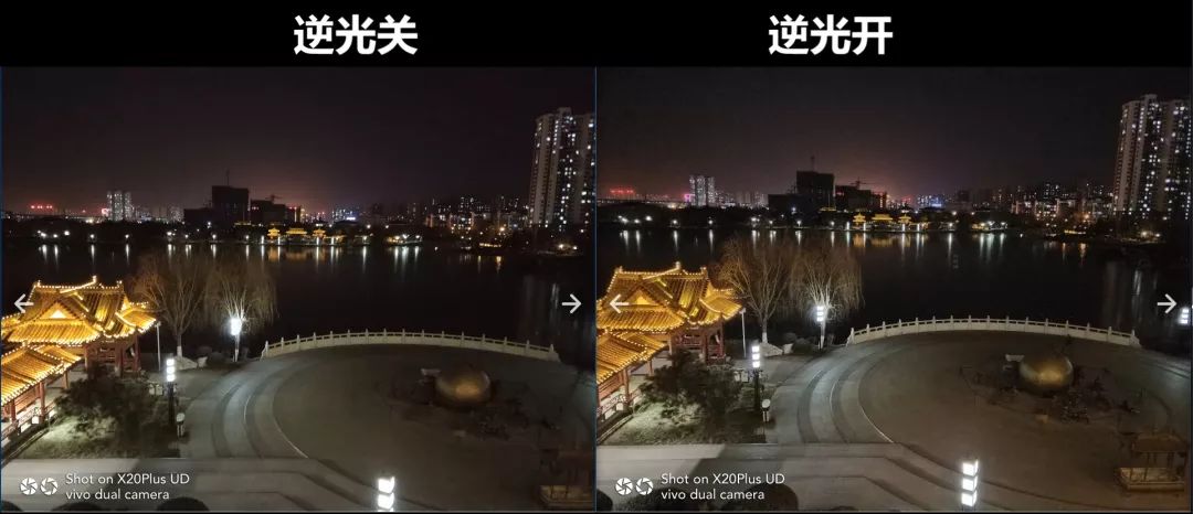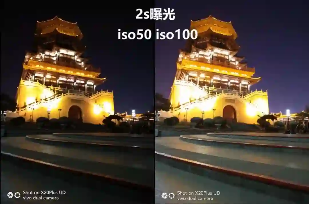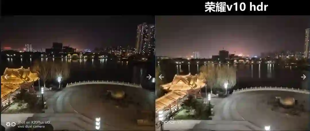 到了夜景就不行了。vivo 还是去压制高光。我们看左下角的瓦片。开启逆光之后,瓦片细节更加精致。但是整体噪点也更加夸张。尤其夜空快被白色噪点染成灰色了。