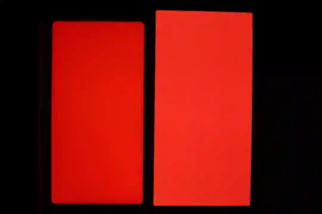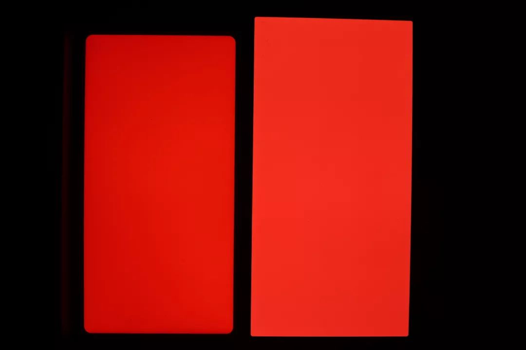 屏幕不支持色域色温调节。色温 7200k,NTSC 色域 93%,亮度 425 尼特。整体的表现属于 Super AMOLED 屏的一般水平。红色还是不够正,有一点偏黄。没有倒装屏幕的果冻效应。