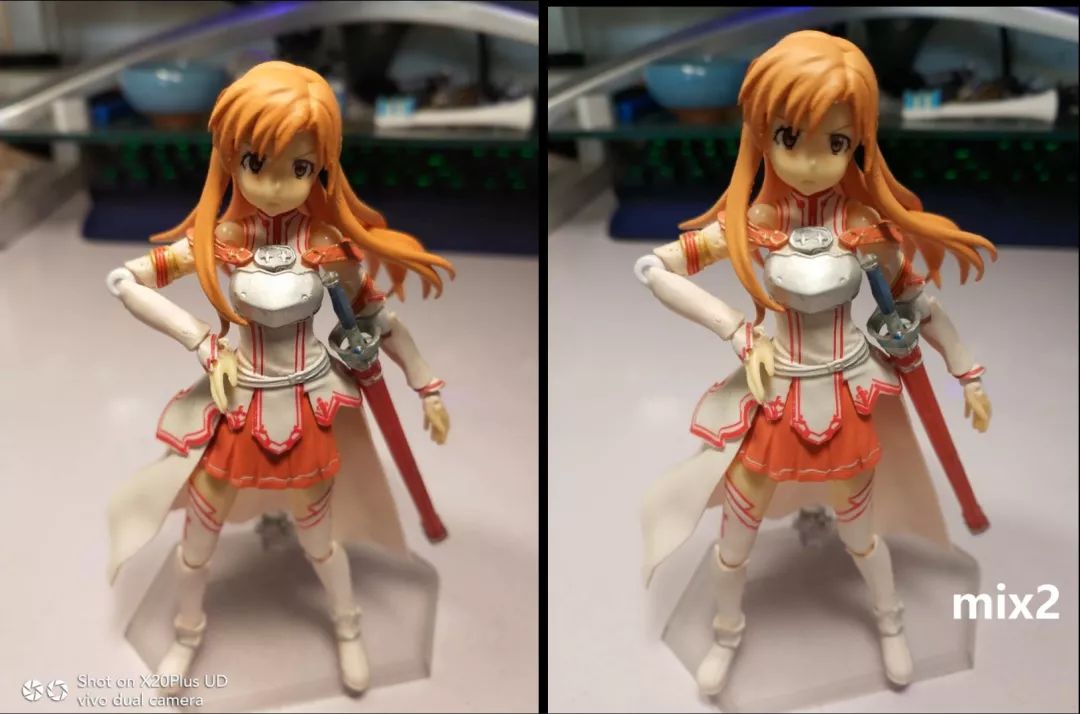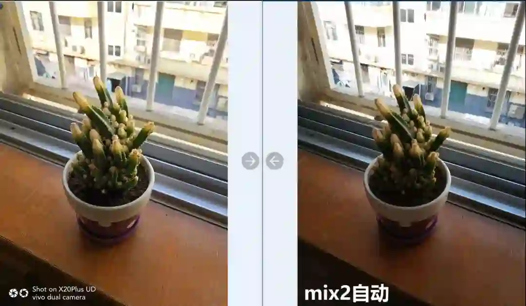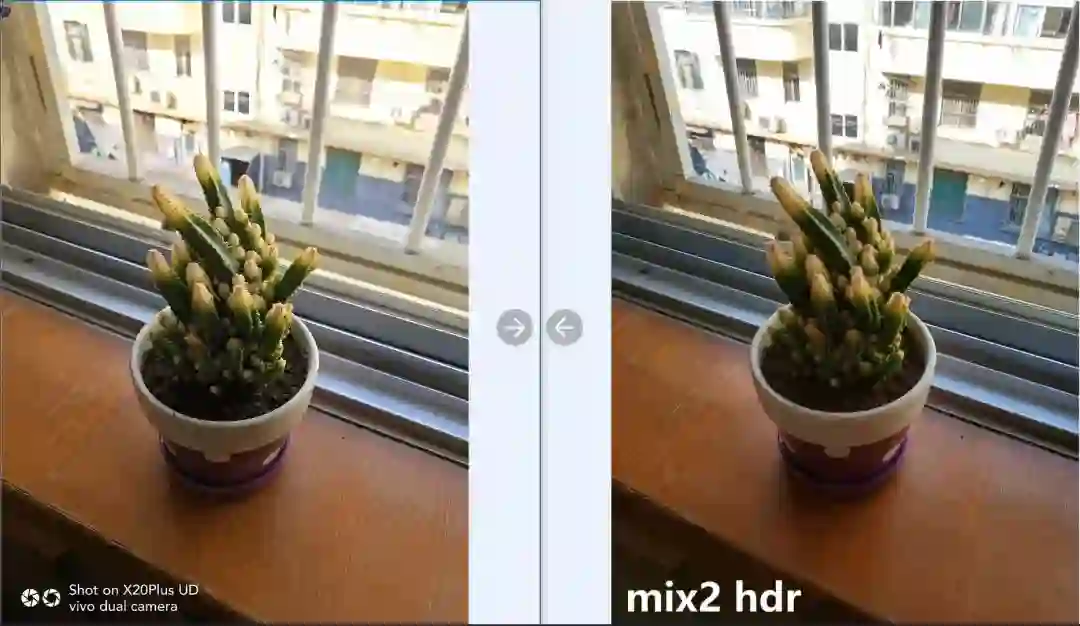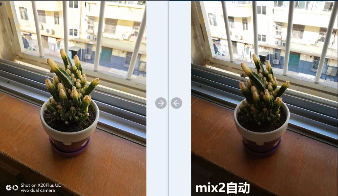 动态范围方面。vivo 的叫逆光,其实就是自动 HDR。窗外景色不过曝,仙人掌模特的明暗细节也完整。虽然锐化的有点吓人。土都跟砂子一样了。小米 MIX 2 就当个反面例子。没有自动 HDR。因为光圈小,背景虚化也少。开启 HDR 之后,亮度色彩追上了,不过仙人掌的影子几乎就看不见了。