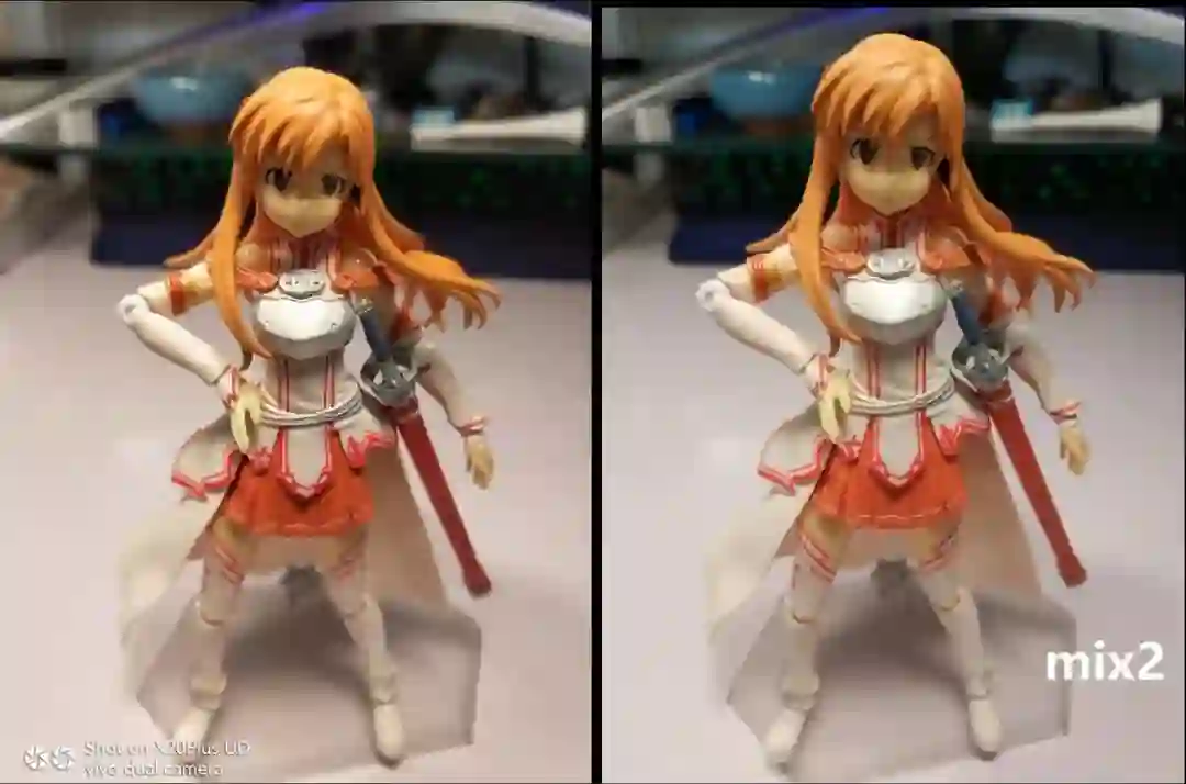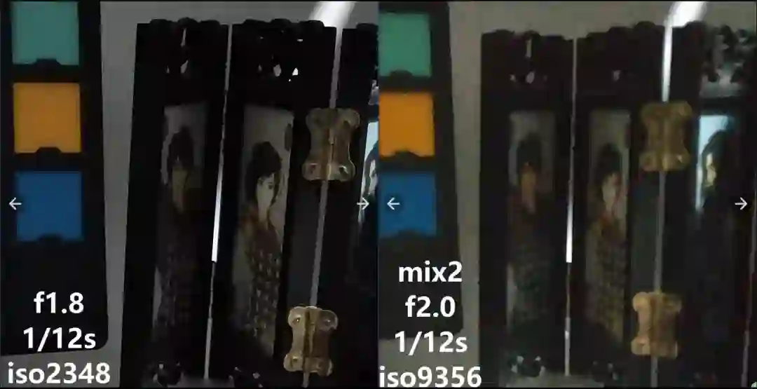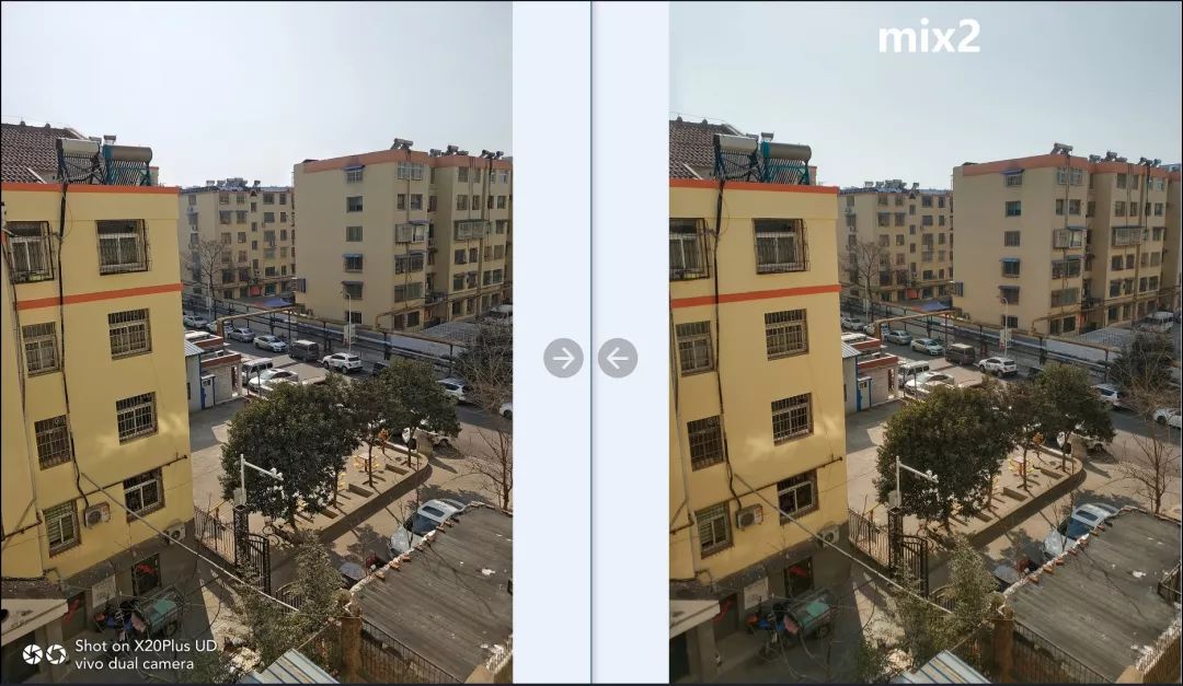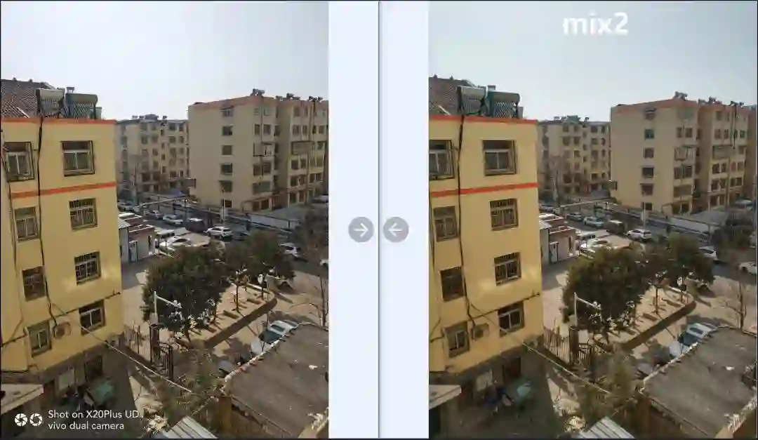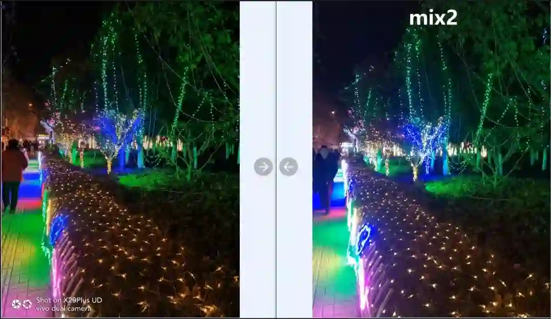 第一个环节我们看防抖。对不住,只借到 4 轴防抖的小米 MIX 2,小米是没有电子防抖的。只能用光学防抖。而 X20 Plus 是光学防抖加电子防抖都有。明显可以看出,画面被裁剪掉了一圈。电子防抖必须裁剪掉一圈才能把抖动的部分去掉。同时 vivo 也提高了亮度。结果就是防抖效果良好,但是画质劣化的非常明显,所有细节都是肉呼呼的。而小米就锐利的多。虽然画面亮度低了一些,但是也比较真实。噪点多的吓人,是感光底小的传感器弱光差。vivo 是拍照只能用光学防抖,录像只能用电子防抖。