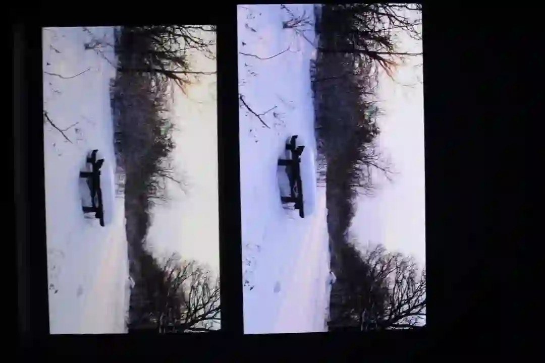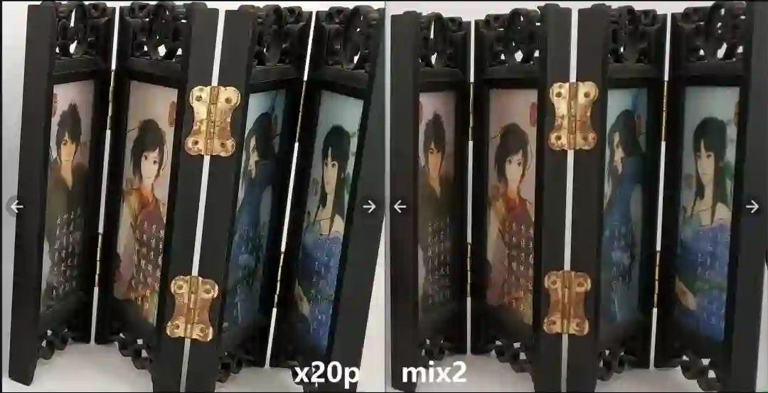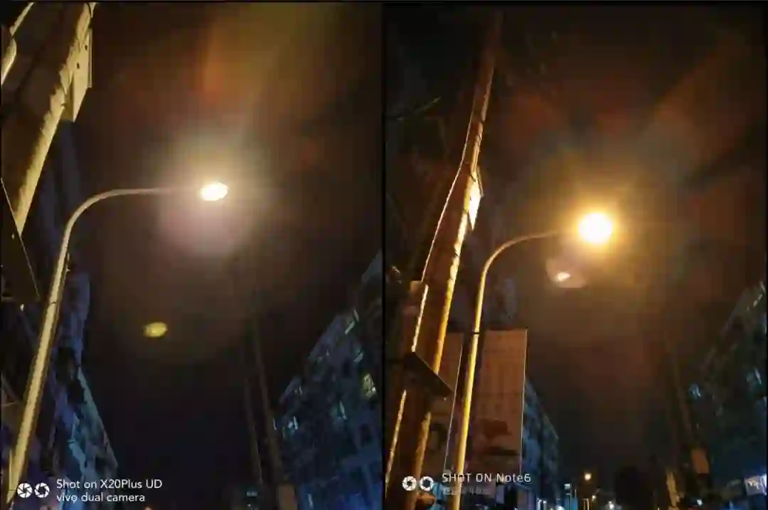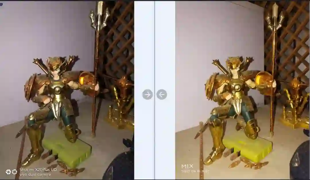 第一个环节我们看防抖。对不住,只借到 4 轴防抖的小米 MIX 2,小米是没有电子防抖的。只能用光学防抖。而 X20 Plus 是光学防抖加电子防抖都有。明显可以看出,画面被裁剪掉了一圈。电子防抖必须裁剪掉一圈才能把抖动的部分去掉。同时 vivo 也提高了亮度。结果就是防抖效果良好,但是画质劣化的非常明显,所有细节都是肉呼呼的。而小米就锐利的多。虽然画面亮度低了一些,但是也比较真实。噪点多的吓人,是感光底小的传感器弱光差。vivo 是拍照只能用光学防抖,录像只能用电子防抖。