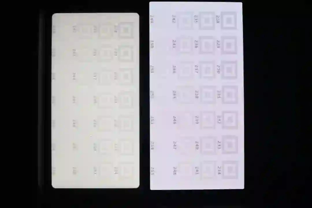 依然使用低频 pwm 调光。以 1/30 秒快门为例,亮度低于 15% 左右的时候出现敏感交替的痕迹。而 1/60 秒的快门下,40% 的亮度就出现了。具体的含义和对人的影响我在频闪专题解读过了,这里不多赘述。