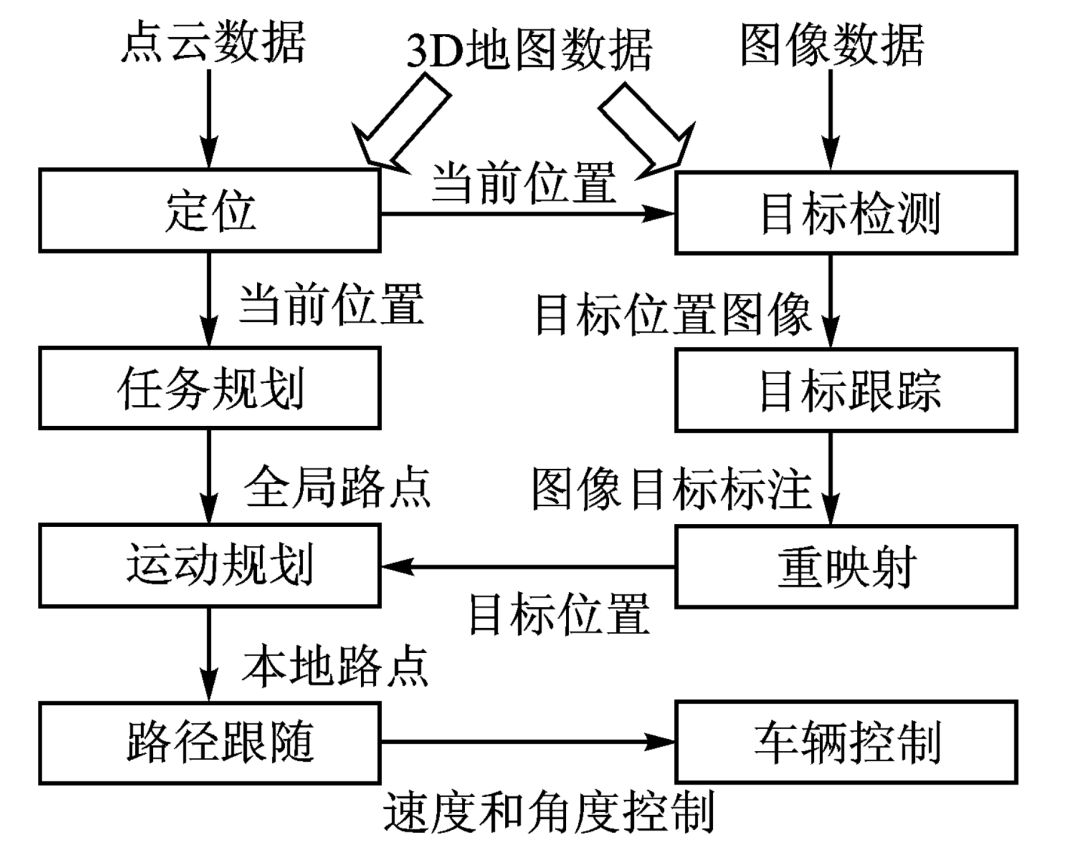 在交通场景识别、路径规划和车辆控制等每类组件中都包括算法集合,例如交通场景识别要求定位、目标检测和目标跟踪算法 [6]。路径规划通常包括任务和运动规划,车辆控制对应路径跟踪算法,其中算法基本控制和数据流如图 5 所示。