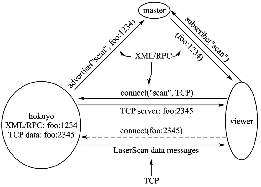 图 2 展示了 ROS 通信流程,节点向 Master Advertise 或者 Subscribe 发布感兴趣的 Topic。当创建连接时,下游节点会向上游节点 TCP Server 发布连接请求,等连接创建后,上游节点的消息就会通过连接送至下游节点。