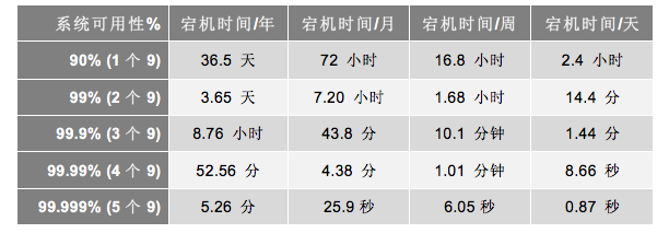 这个公式就是计算系统可用性的,也就是我们常说的,多少个 9,如下表所示。