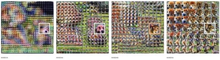 去年在在线期刊 Distill 上,谷歌大脑的研究人员再次使用这项技术将单个神经元在网络中是如何工作的进行了可视化,这项工作让我们可以看到在网络中间的各个神经元如何一步步检测到图像中的各个事物,并且让我们看到随着网络层次的加深图像如何越来越复杂。AI 科技评论曾经在下面这篇文章中详细介绍过《谷歌的新CNN特征可视化方法,构造出一个华丽繁复的新世界》。