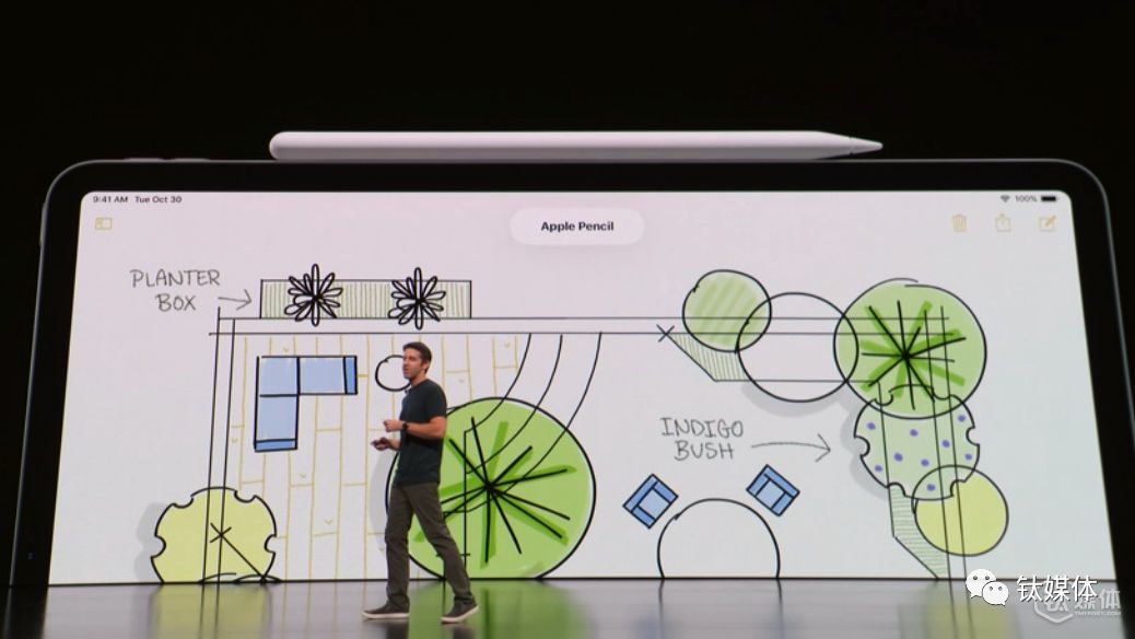 既然 iPad Pro 都采用了新的接口,过去的 Apple Pencil 是不能捅进去充电了,于是新的 Apple Pencil 也一并发布。这一次在设计方面,有点致敬老对手微软的意思,能够吸附在 iPad Pro 顶部,并且边吸边“吸电”——没错,这次 Apple Pencil 终于不用“捅菊花”了,而是堂堂正正地在 iPad 侧面充电。最为重要的一点是,这一次,Apple Pencil 终于支持机身双击快速切换功能(在自带的备忘录内,是切换至橡皮)。