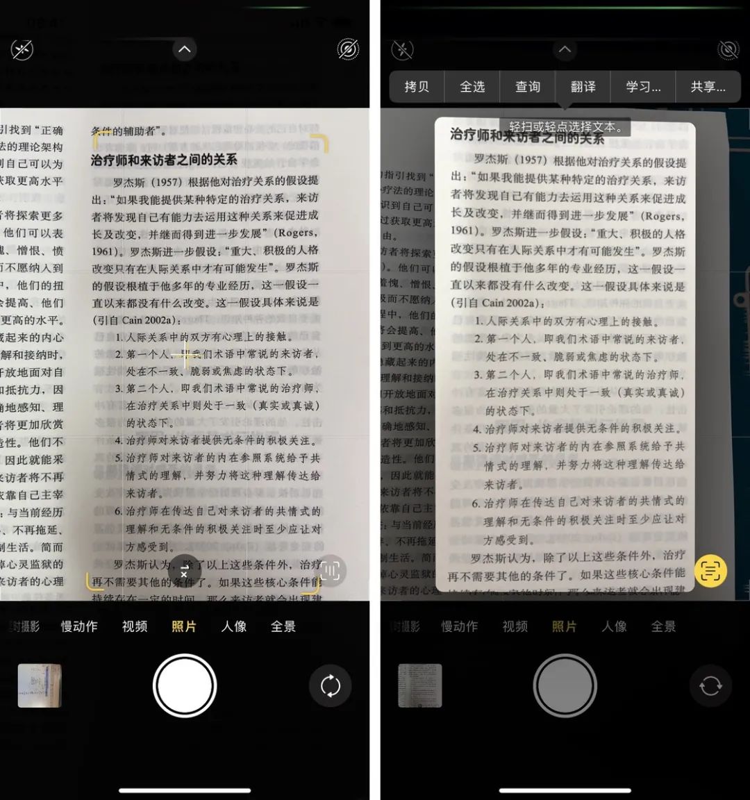 以往如果我们想要将照片或所拍摄屏幕上的文字保存为文本格式,少不了要经历拍摄、分享至第三方应用、识别、点选复制、编辑等多个步骤,实况文本的加入能够帮助我们直接减少中间环节,允许我们直接复制取景框和图片中的文字。