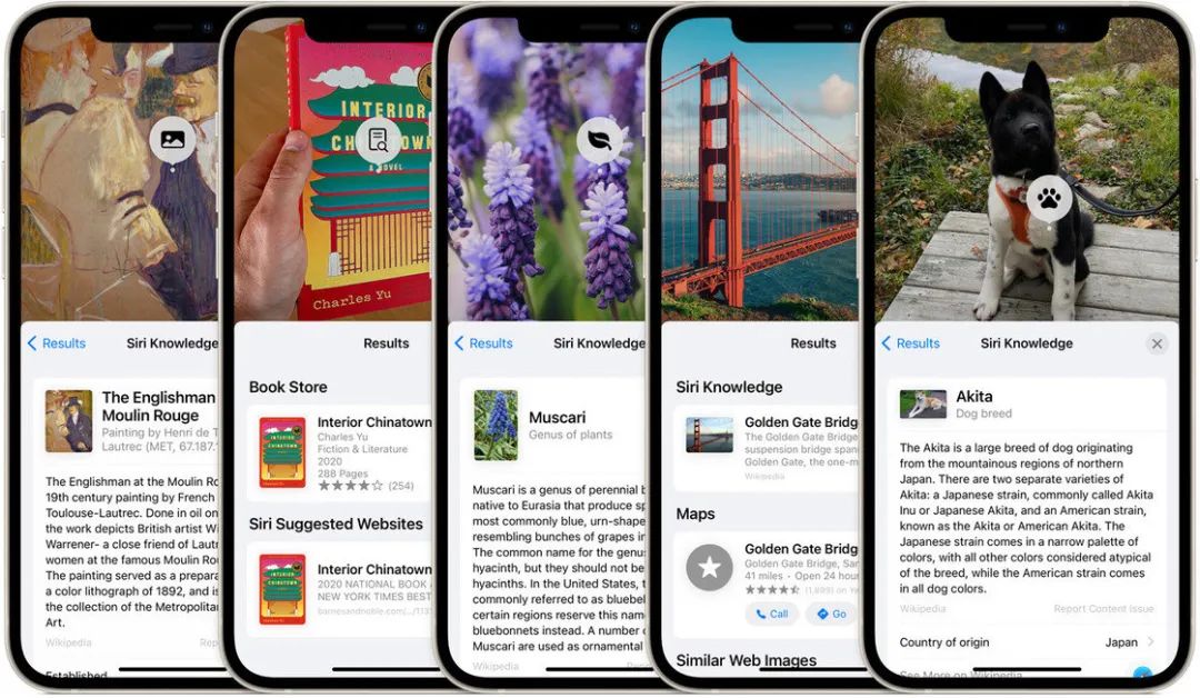除了实况文本这一功能,Apple 在 WWDC21 大会上还介绍了名为 Visual Look Up 的一项功能,这一功能可以帮助用户识别相片中的场景、物品,支持的内容范围包括动植物、绘画、书本、建筑等各种信息,可以视作实况文本功能的加强版和补充,功能类似于 Google 早先推出的 Google Lens。不过,这项功能暂时没有出现在 iOS 15 的第一个正式版本中。