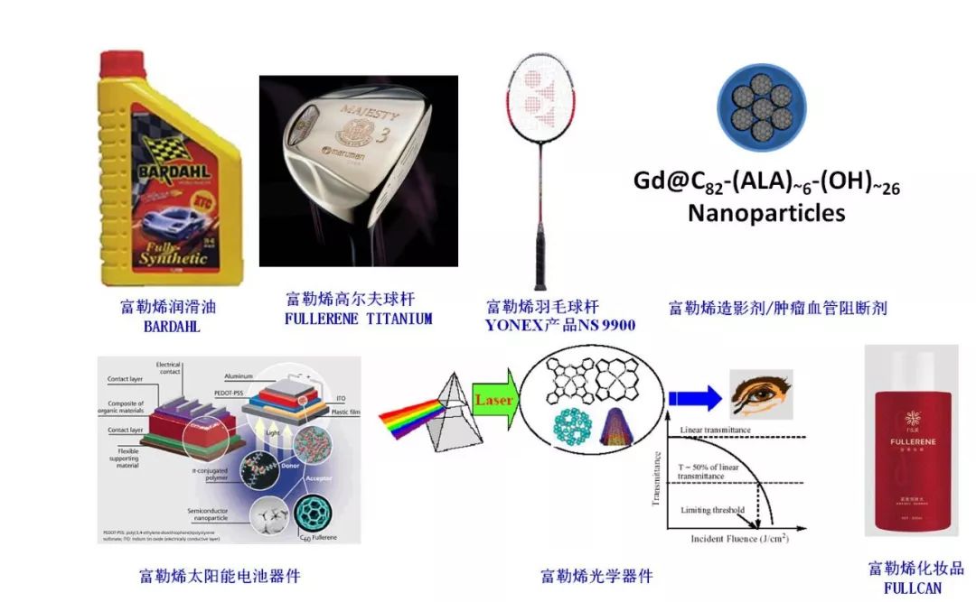 富勒烯这种电子结构的特殊性使其在许多领域具有广泛的应用。例如,富勒烯是有机柔性太阳能电池的主要活性成分,现在能量转化效率已经超过10%的应用门槛;富勒烯添加在润滑油里,可以提高润滑油使用寿命30%以上;在氧碘化学激光器内腔涂布一层富勒烯,可以使激光能量成倍提高。